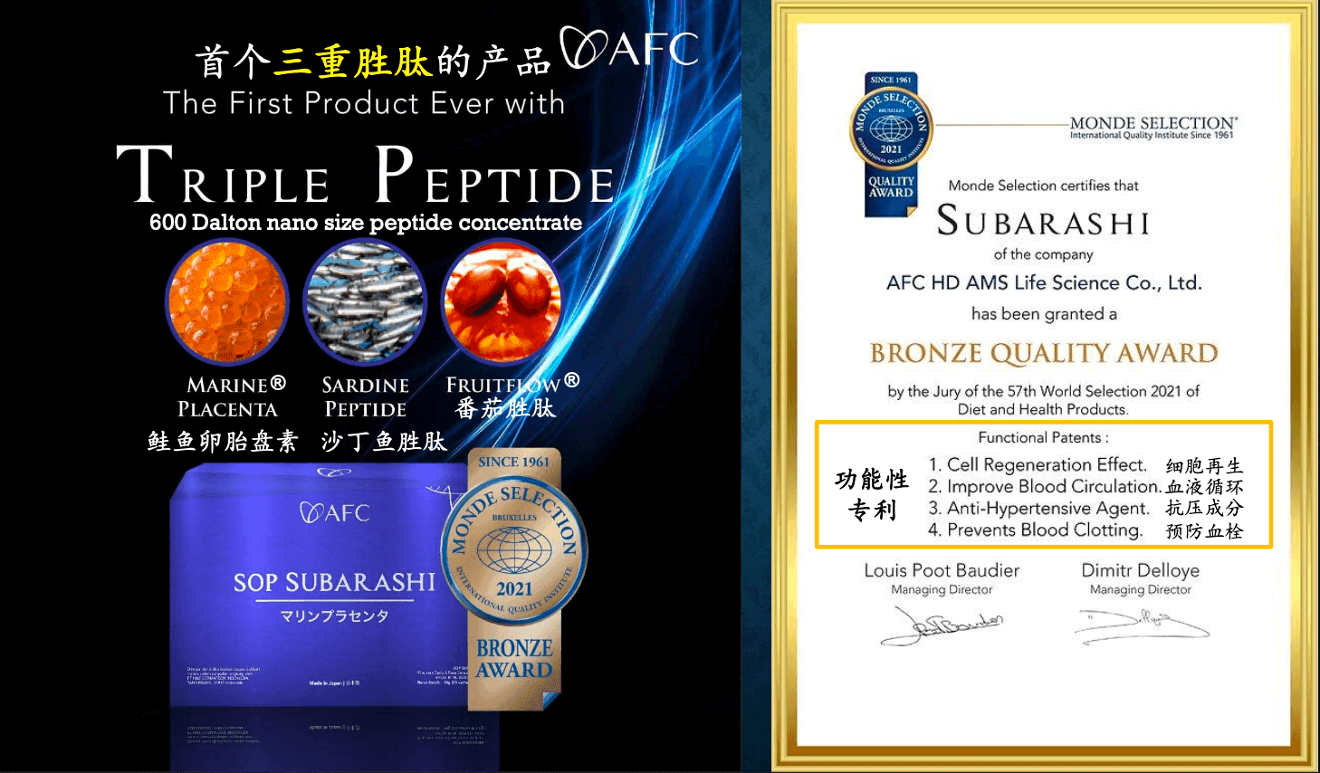 AFC 勝肽系列日本製造,不含抗生素、農藥、重金屬、有害化學物質、荷爾蒙及核輻射污染。SOP SUBARASHI 通過 HALAL 認證;榮獲 Monde Selection 銅獎與多次 Helmy Attamimi「年度產品」。